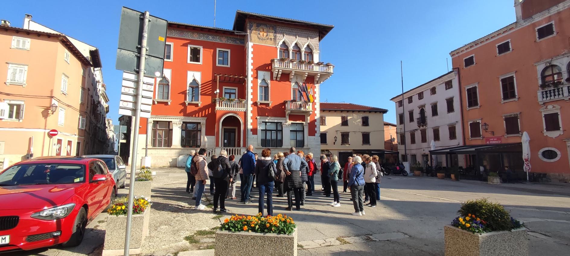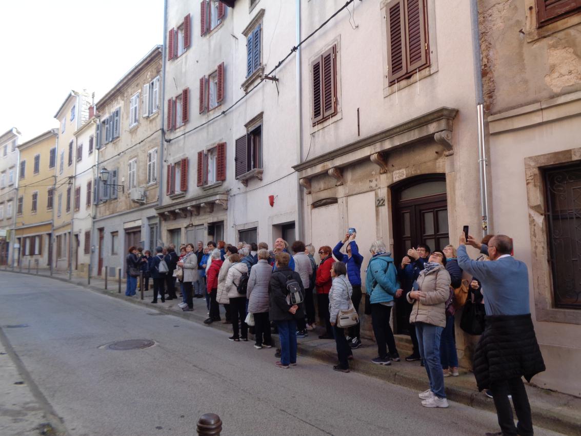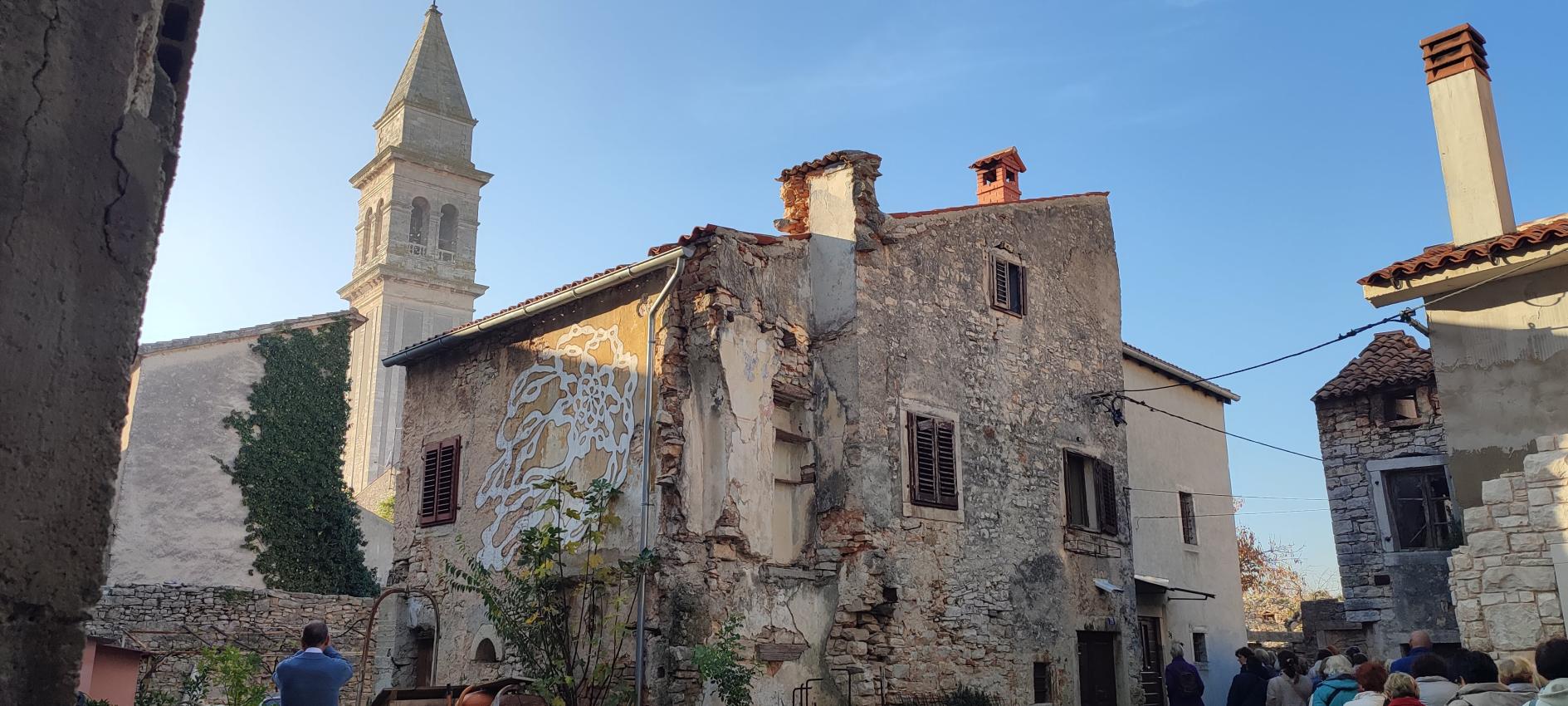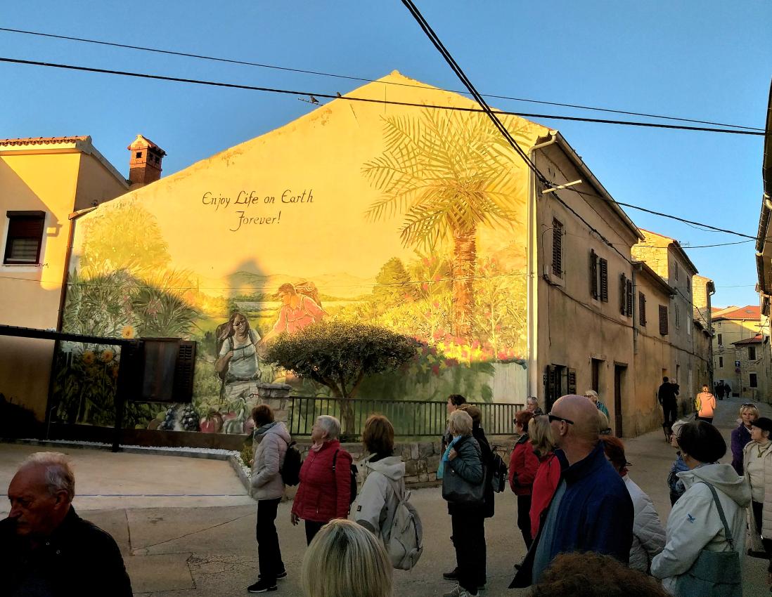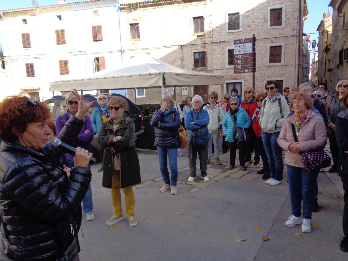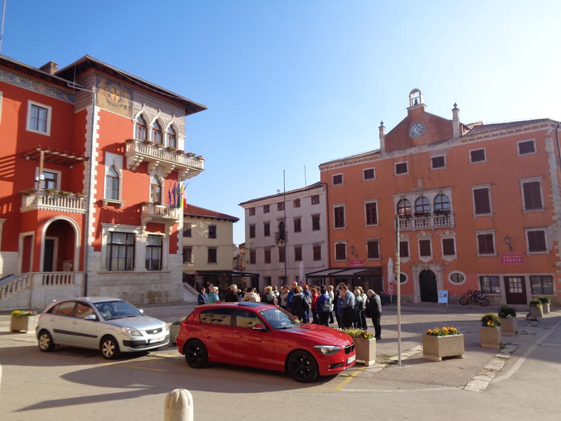 Na parkirišču nas je že čakala vodička Morena Matijaš in nam predstavila načrt ogleda »svojega« mesta. Že po prvih korakih smo lahko sklepali, da to ni običajno srednjeveško mestece. Leži na komaj 135 m nadmorske višine, kar nam bo olajšalo hojo, ni obzidja, ni kaštela. Bodo pa cerkvice, z murali poslikana pročelja, ki popestrijo kamnite mestne hiše.