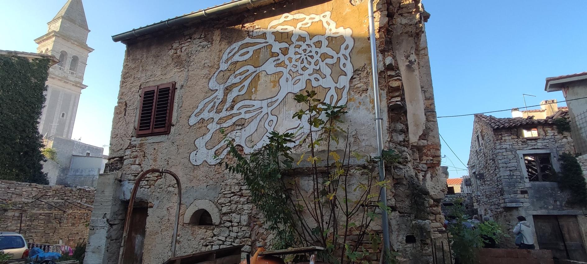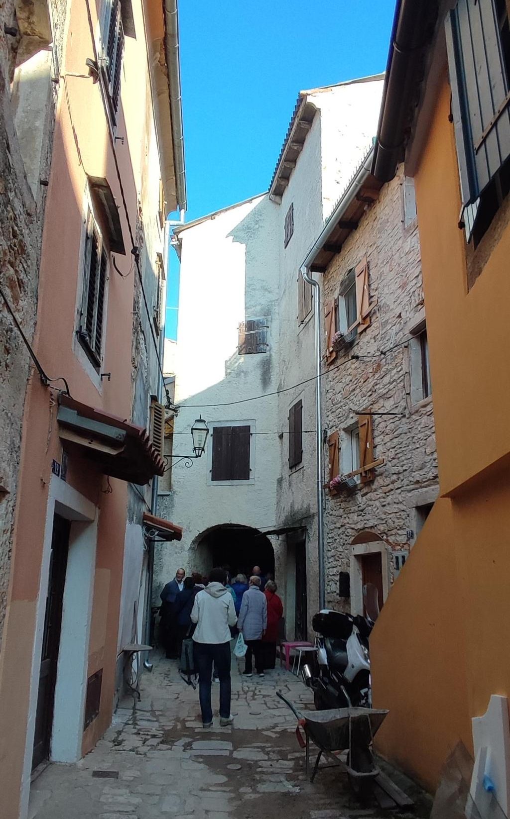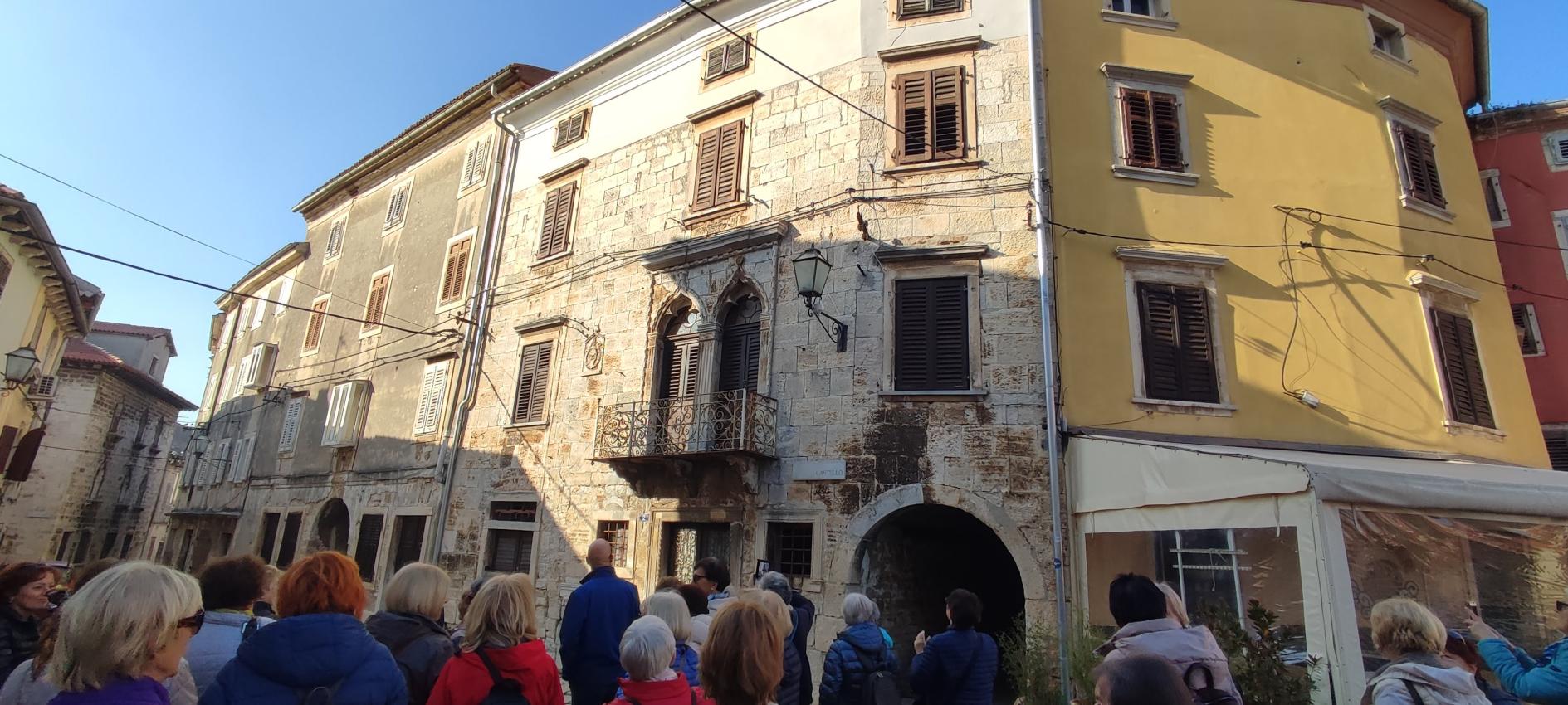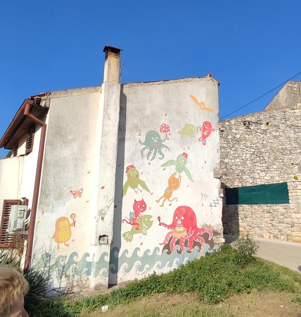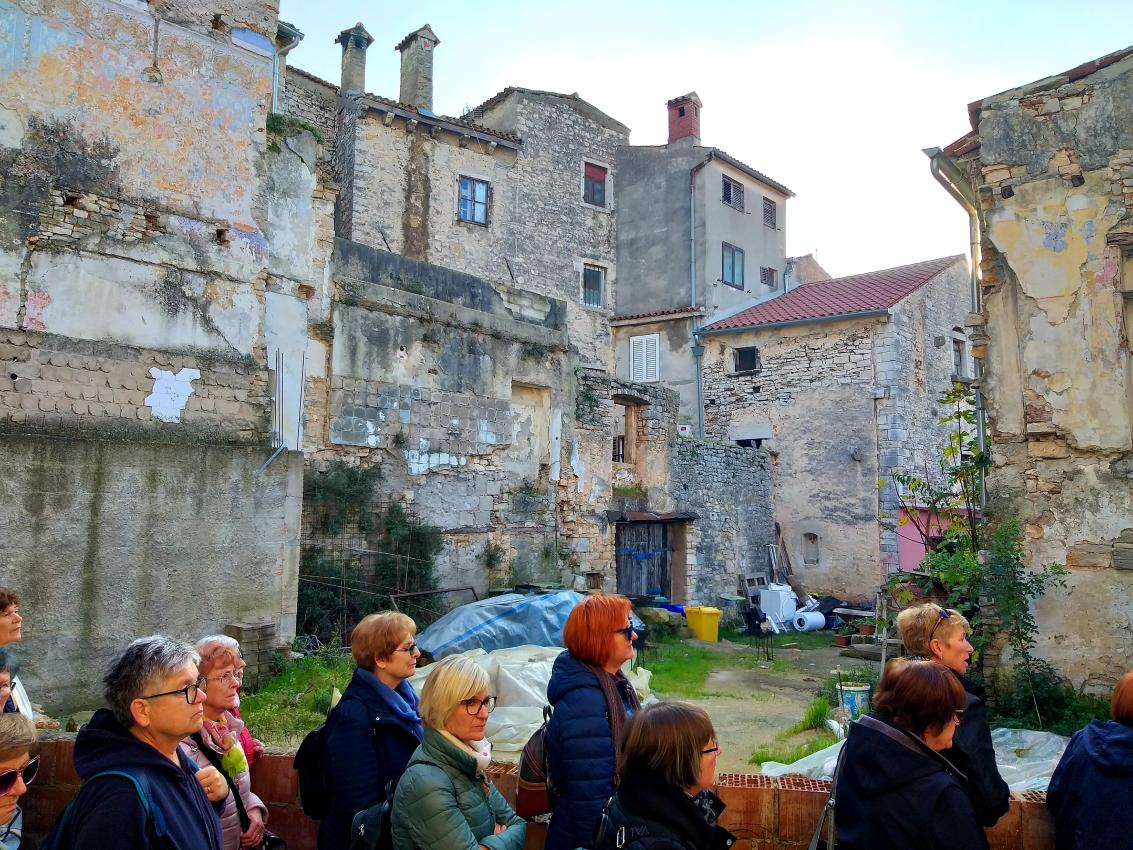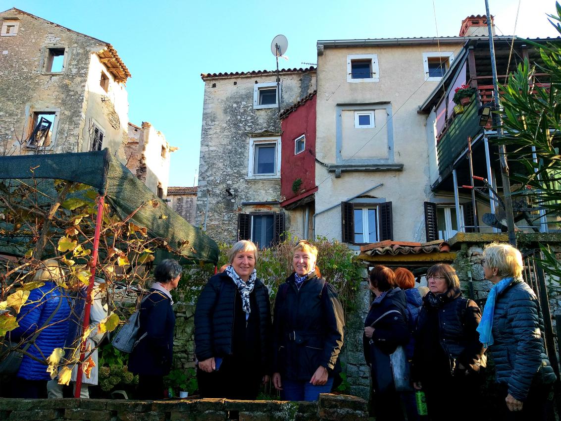Na parkirišču nas je že čakala vodička Morena Matijaš in nam predstavila načrt ogleda »svojega« mesta. Že po prvih korakih smo lahko sklepali, da to ni običajno srednjeveško mestece. Leži na komaj 135 m nadmorske višine, kar nam bo olajšalo hojo, ni obzidja, ni kaštela. Bodo pa cerkvice, z murali poslikana pročelja, ki popestrijo kamnite mestne hiše.