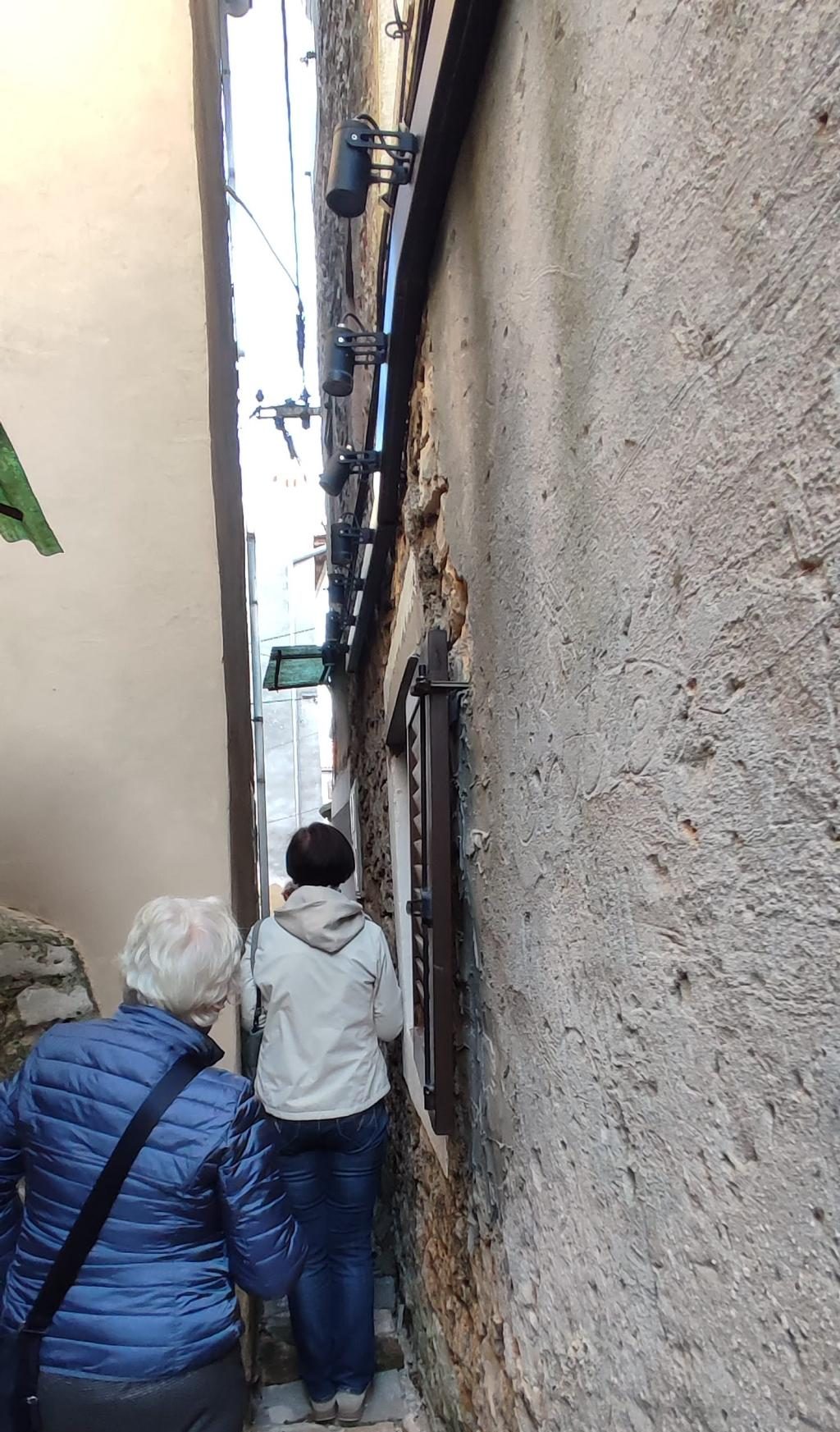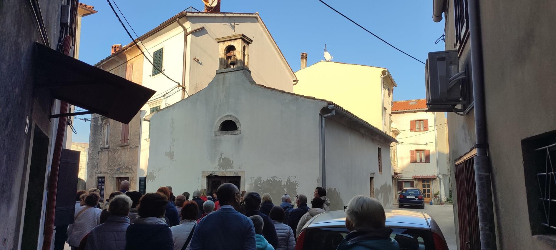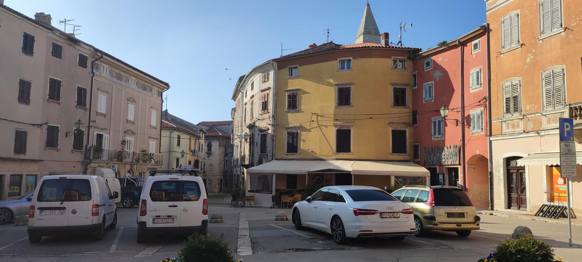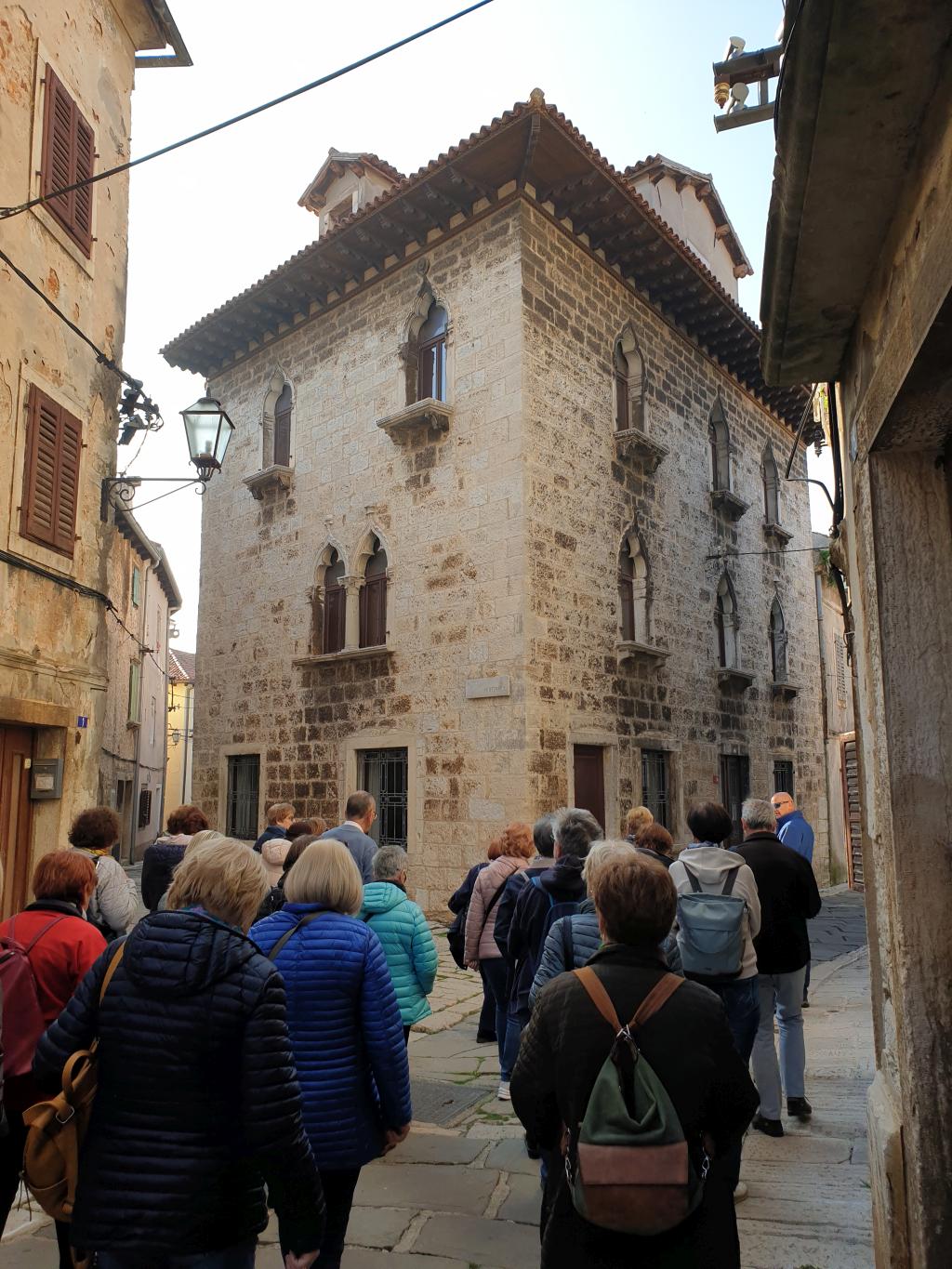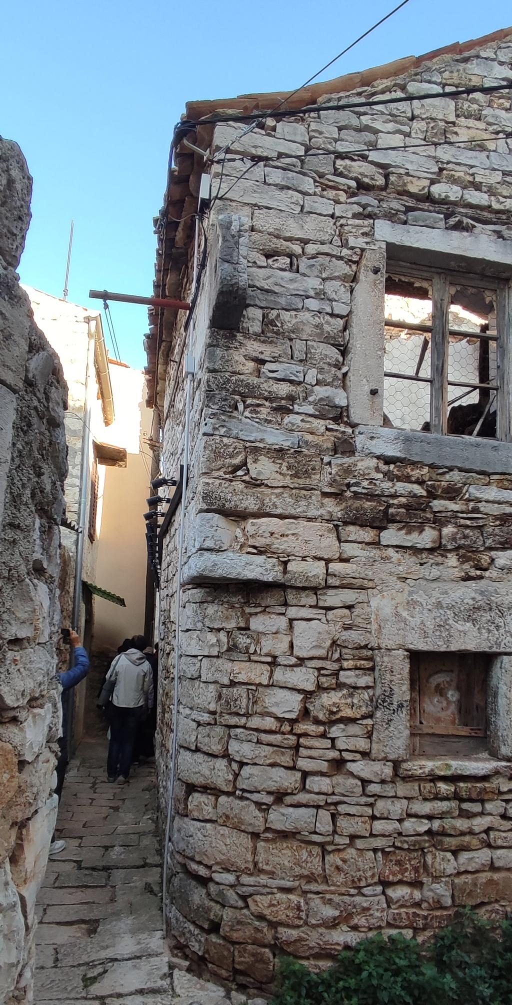 Na parkirišču nas je že čakala vodička Morena Matijaš in nam predstavila načrt ogleda »svojega« mesta. Že po prvih korakih smo lahko sklepali, da to ni običajno srednjeveško mestece. Leži na komaj 135 m nadmorske višine, kar nam bo olajšalo hojo, ni obzidja, ni kaštela. Bodo pa cerkvice, z murali poslikana pročelja, ki popestrijo kamnite mestne hiše.