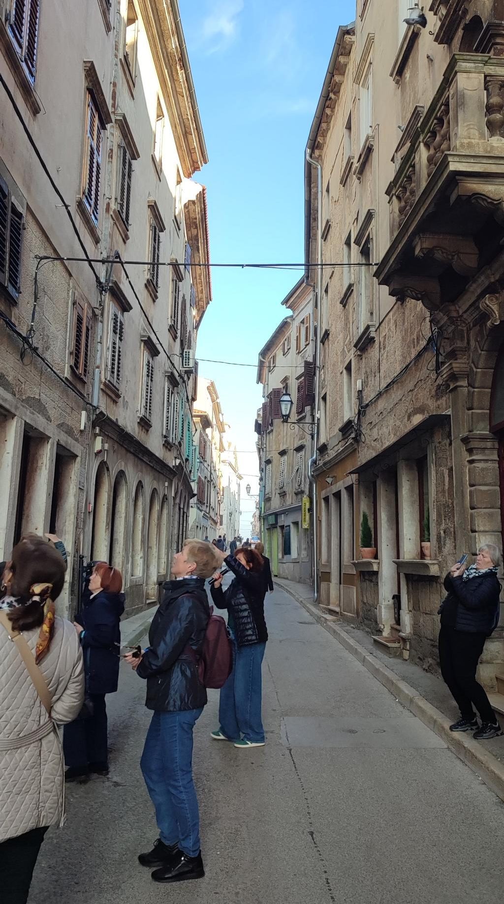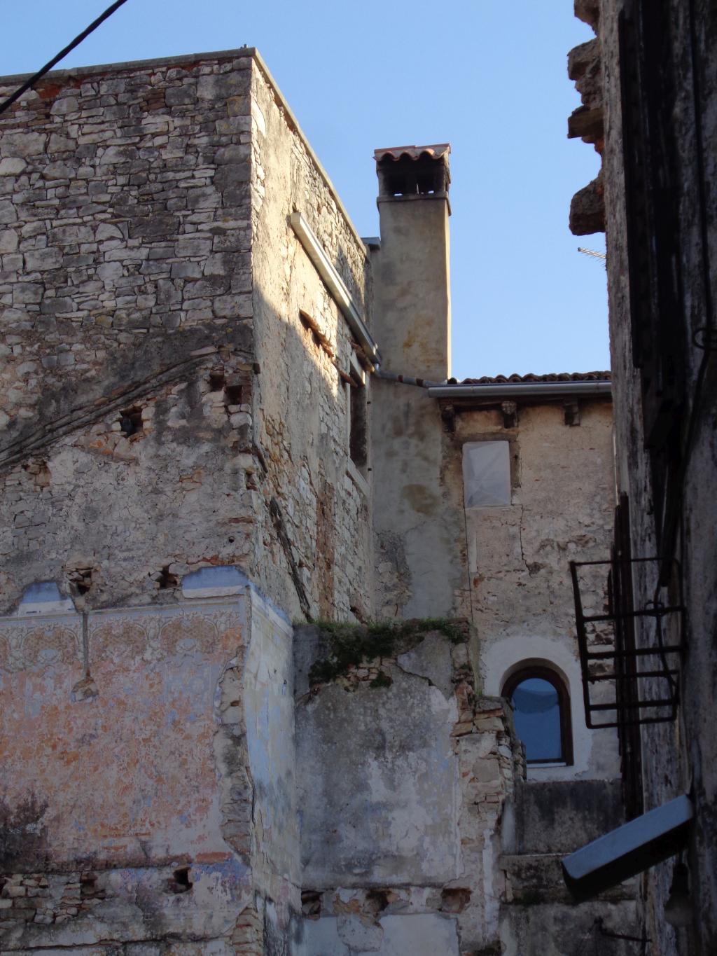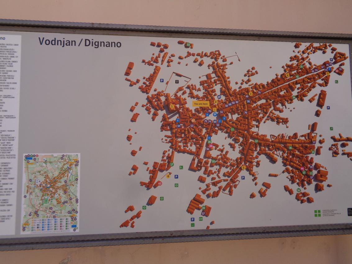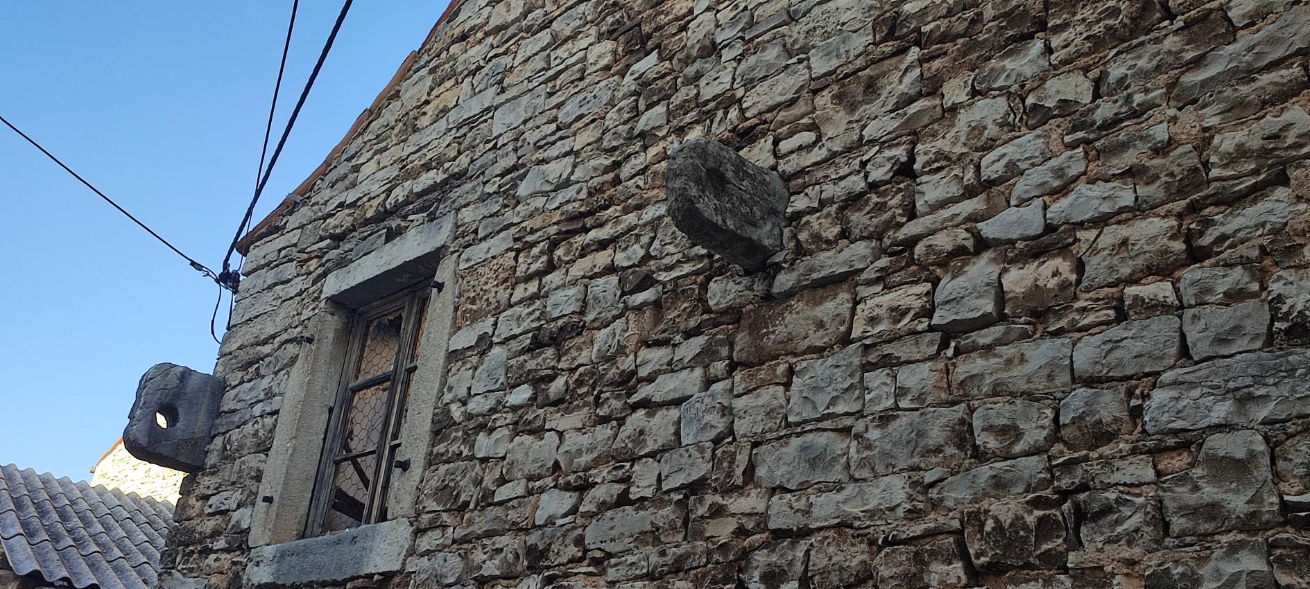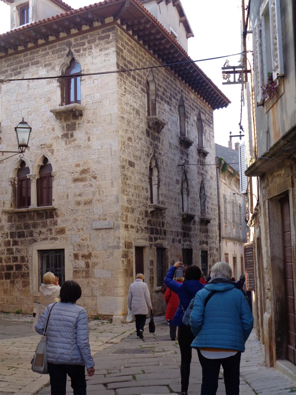 Tako ali drugače – Vodnjan je rojen iz kamna in tak je še danes. Preprost gradbeni material, obstojen in hkrati okras – zlasti plemiških in bogatih meščanskih hiš. Gospa Morena je vsako toliko zaustavila korak in nam usmerjala pozornost na kamnite stile (gotsko – beneški, baročni, renesančni) in detajle. Skoraj vsako hišo, zlasti vzdolž najdaljše ulice (približno 2 km) v Istri, v kateri so drug zraven drugega živeli obrtniki in trgovci, so hiše krasili unikatni grbi, kamnite glave, stebri, balkoni, okna in portali. Balkone so vodnjanski kamnoseki krasili z rastlinskimi motivi. Stebri so imeli uporabno in estetsko funkcijo. Krasili so jih v korintskem stilu. V zgornjih nadstropjih smo opazili tudi nekakšne kamnite nosilce z luknjo, v katere so vstavljali lesene palice, ki so jih uporabljali za obešanje in vlečenje ročno tkanih tkanin. Nekatere hiše imajo še kamnite stopnice – baladurje. Kamnite glave resnega videza nad okni ali vrati, kot da nas opazujejo in kontrolirajo življenje na ulici. Okrašena, večslojna okna (bifore, trifore) dajejo pročeljem razgiban, a skladen videz. Staro mesto pa ima še eno zanimivost najkrajšo in najožjo uličico (50 cm). Sreča, da smo vsi »elegantni« in smo se brez težav sprehodili skoznjo. Posebni so tudi obokani podhodi, ki so skrajšali pot z ene strani najdaljše ulice na drugo stran. V podhodu so zazidani tudi vsi vogali, da se tatiči in nepridipravi niso mogli skriti. Posebnost mesta so tudi notranja dvorišča, ki jih ogreva sonce (izredna zamisel) in dimniki – čisto vsak drugačne oblike.