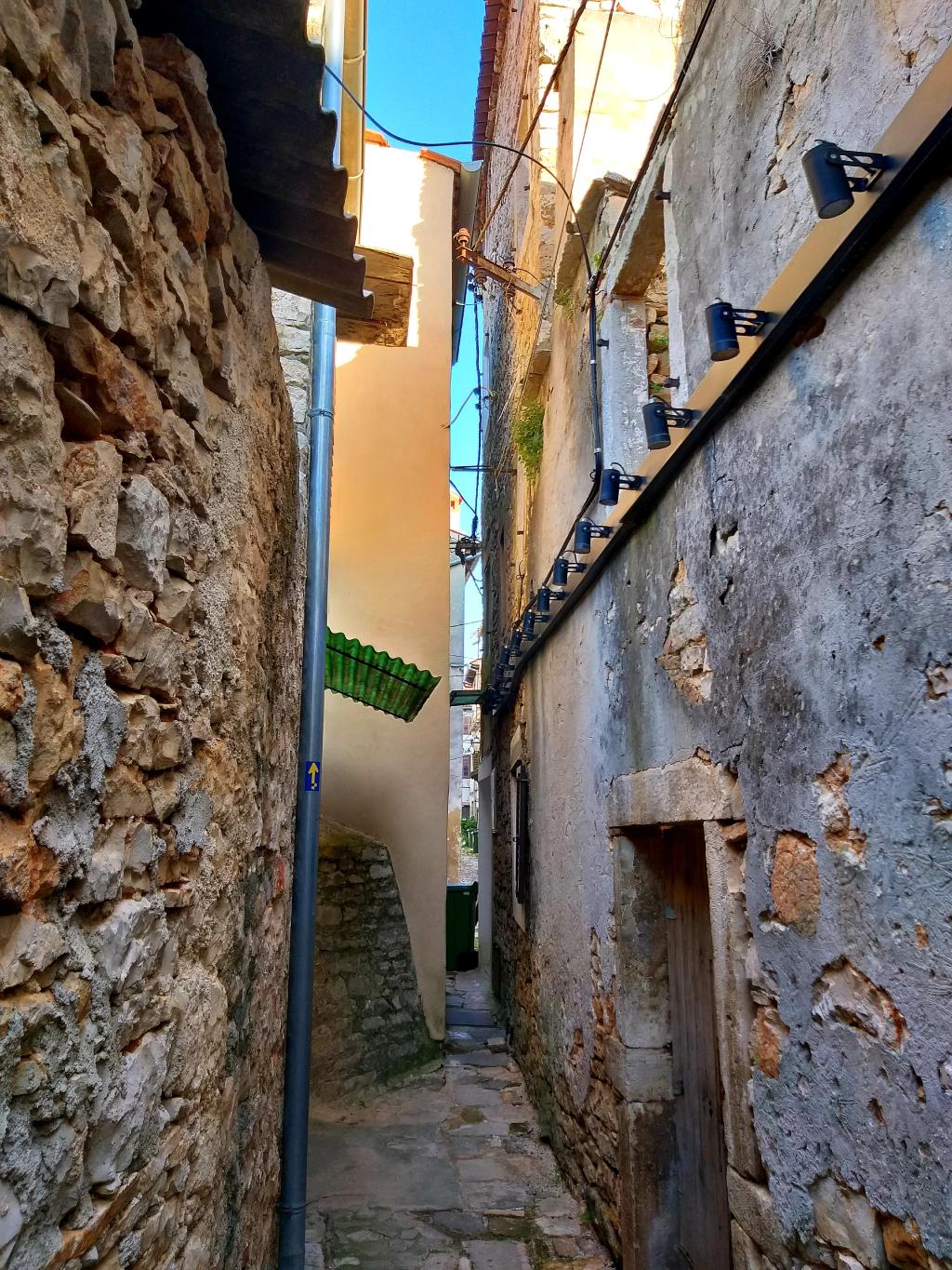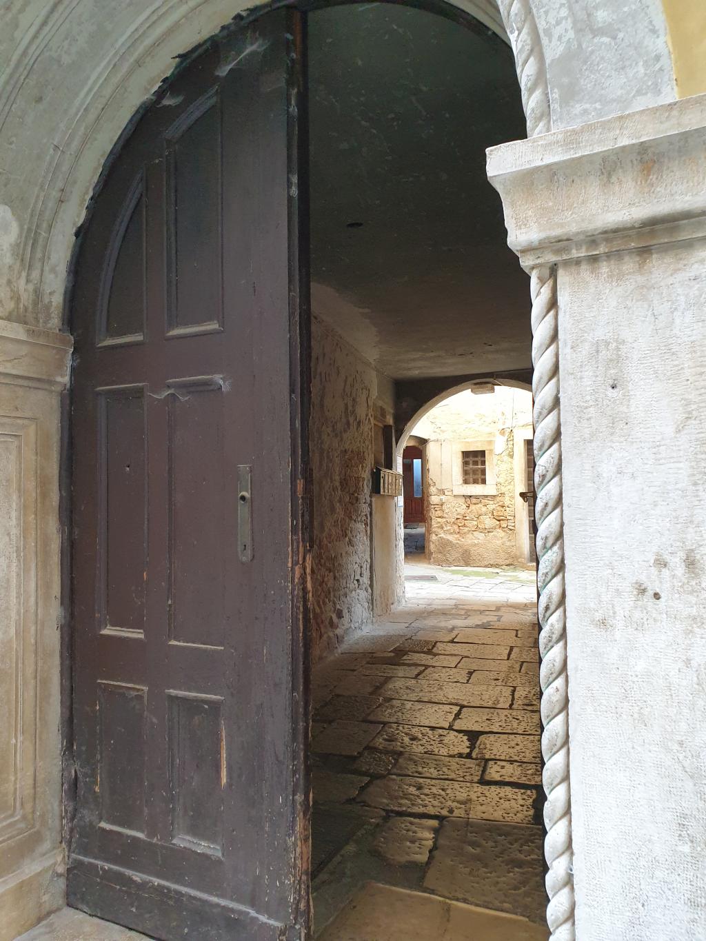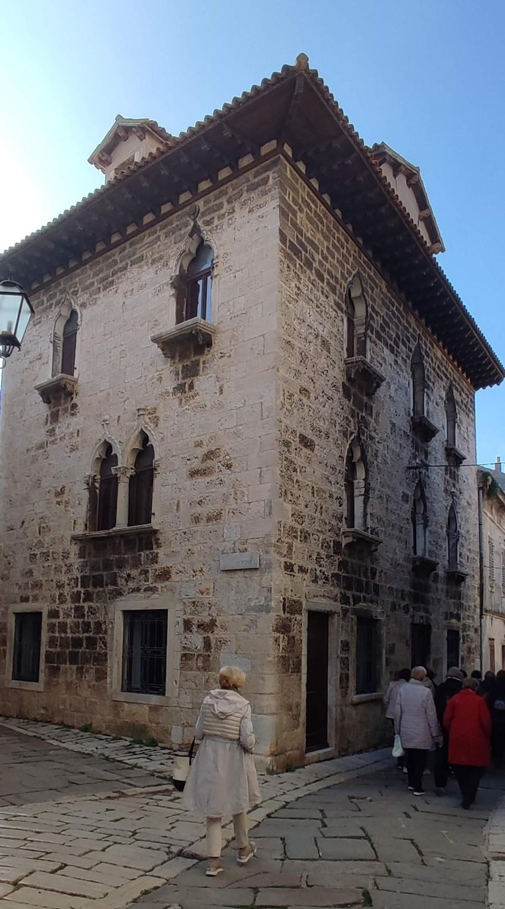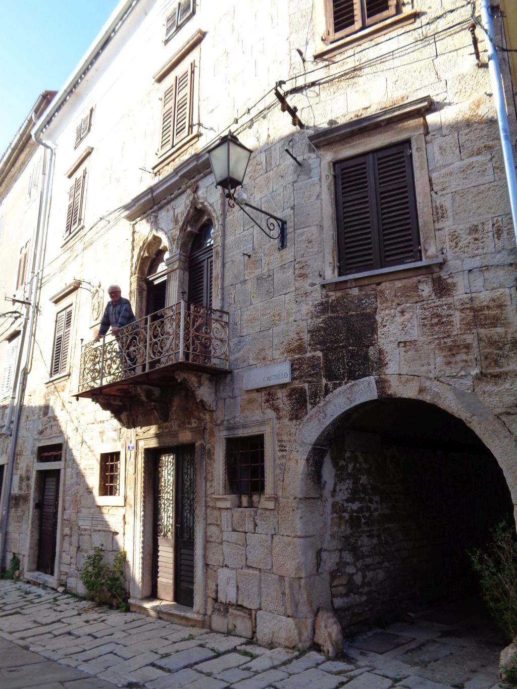 Tako ali drugače – Vodnjan je rojen iz kamna in tak je še danes. Preprost gradbeni material, obstojen in hkrati okras – zlasti plemiških in bogatih meščanskih hiš. Gospa Morena je vsako toliko zaustavila korak in nam usmerjala pozornost na kamnite stile (gotsko – beneški, baročni, renesančni) in detajle. Skoraj vsako hišo, zlasti vzdolž najdaljše ulice (približno 2 km) v Istri, v kateri so drug zraven drugega živeli obrtniki in trgovci, so hiše krasili unikatni grbi, kamnite glave, stebri, balkoni, okna in portali. Balkone so vodnjanski kamnoseki krasili z rastlinskimi motivi. Stebri so imeli uporabno in estetsko funkcijo. Krasili so jih v korintskem stilu. V zgornjih nadstropjih smo opazili tudi nekakšne kamnite nosilce z luknjo, v katere so vstavljali lesene palice, ki so jih uporabljali za obešanje in vlečenje ročno tkanih tkanin. Nekatere hiše imajo še kamnite stopnice – baladurje. Kamnite glave resnega videza nad okni ali vrati, kot da nas opazujejo in kontrolirajo življenje na ulici. Okrašena, večslojna okna (bifore, trifore) dajejo pročeljem razgiban, a skladen videz. Staro mesto pa ima še eno zanimivost najkrajšo in najožjo uličico (50 cm). Sreča, da smo vsi »elegantni« in smo se brez težav sprehodili skoznjo. Posebni so tudi obokani podhodi, ki so skrajšali pot z ene strani najdaljše ulice na drugo stran. V podhodu so zazidani tudi vsi vogali, da se tatiči in nepridipravi niso mogli skriti. Posebnost mesta so tudi notranja dvorišča, ki jih ogreva sonce (izredna zamisel) in dimniki – čisto vsak drugačne oblike.