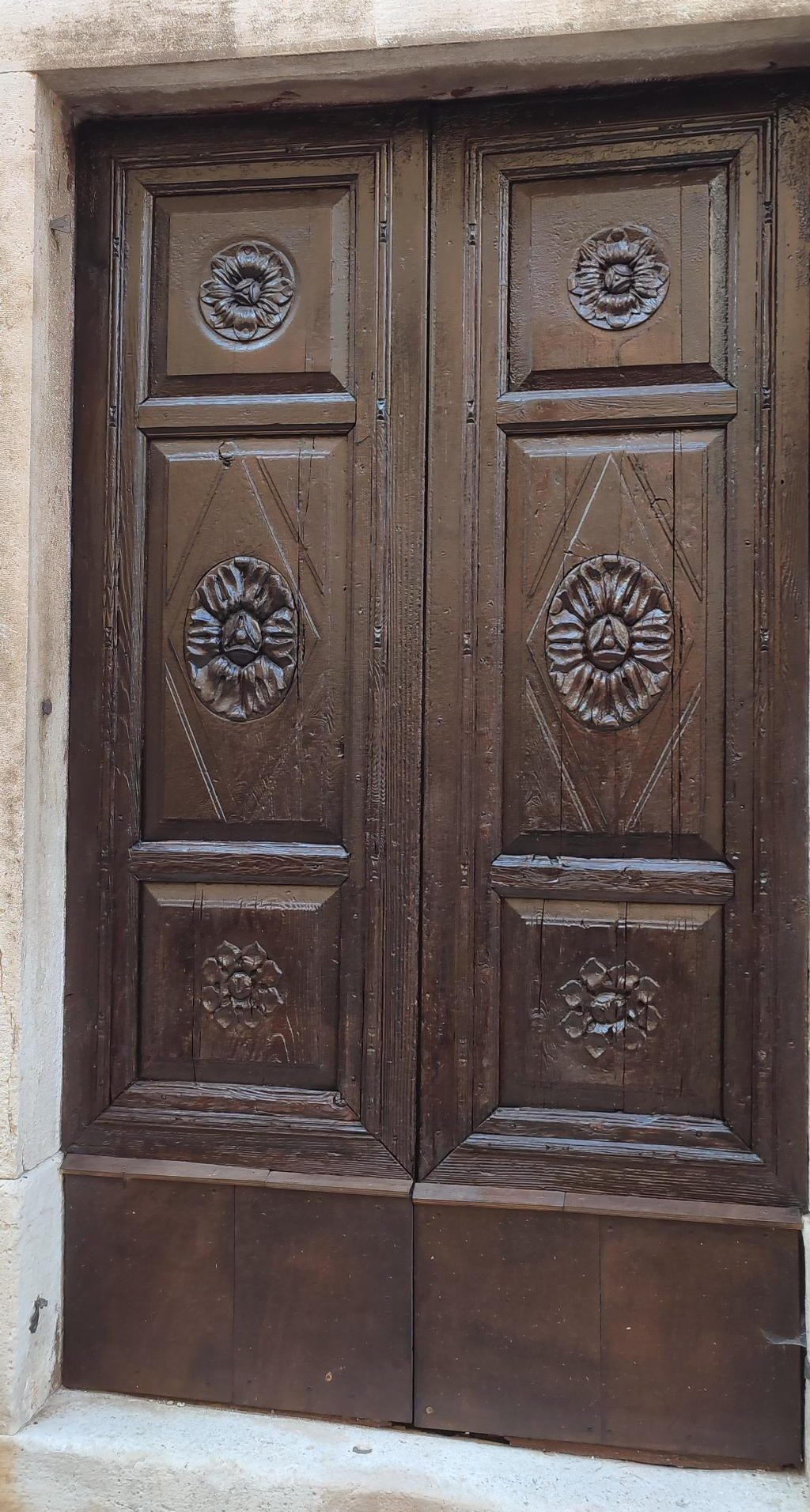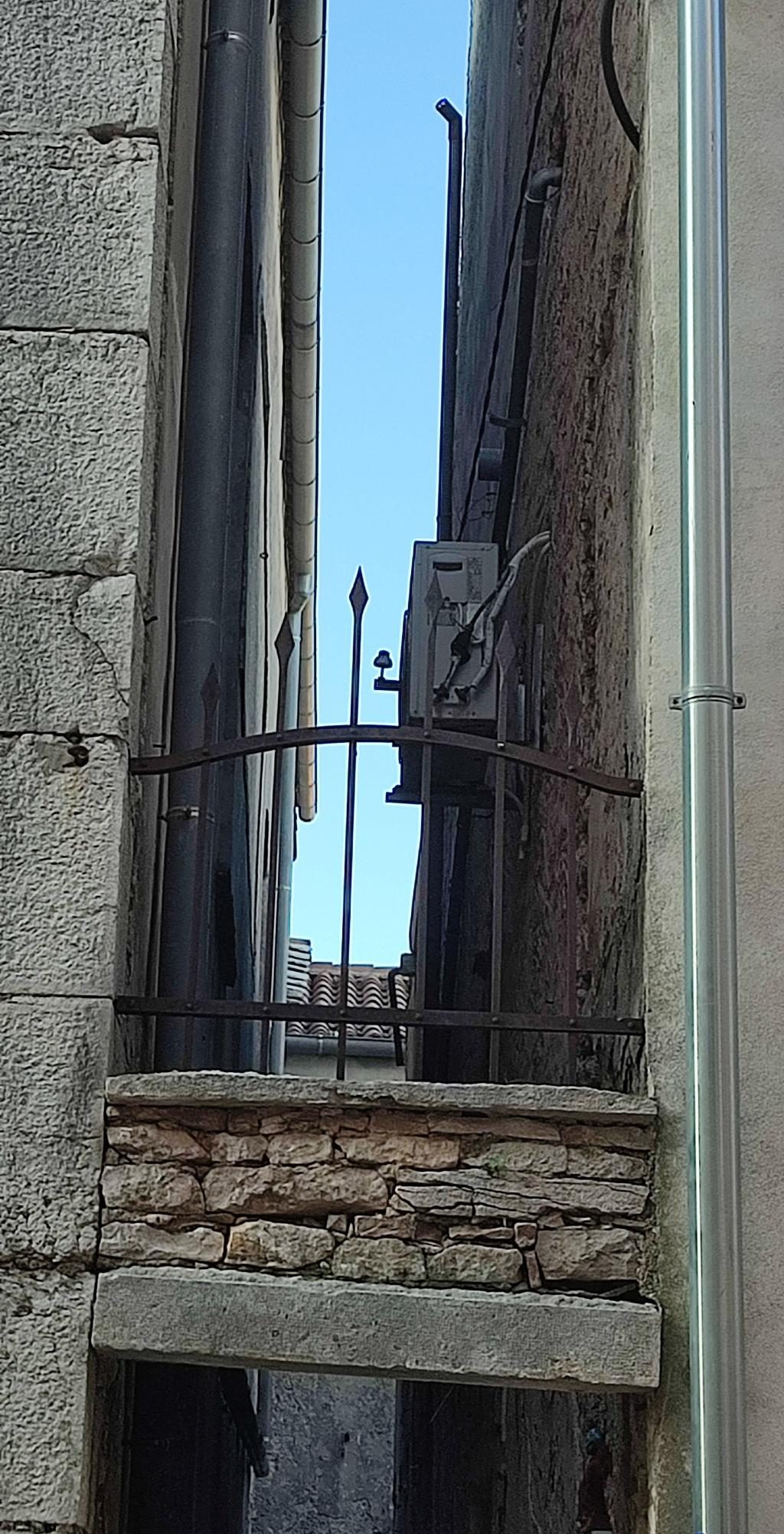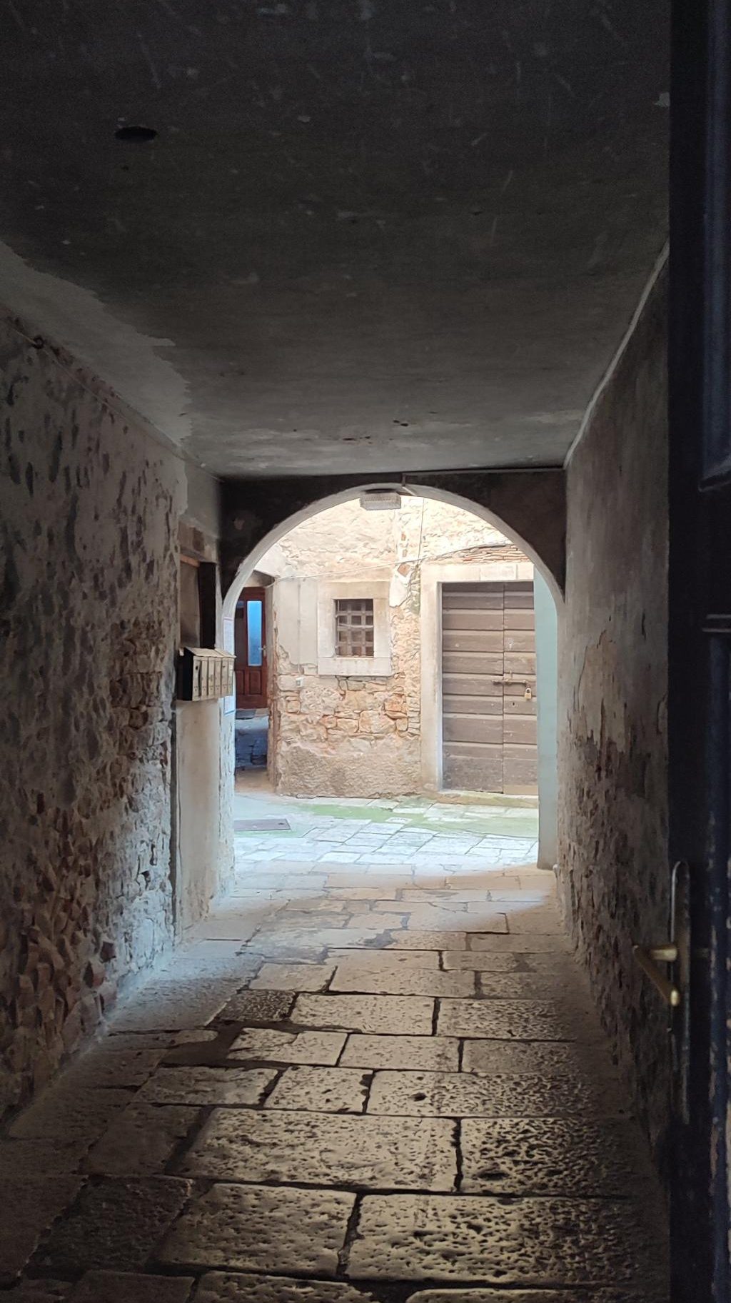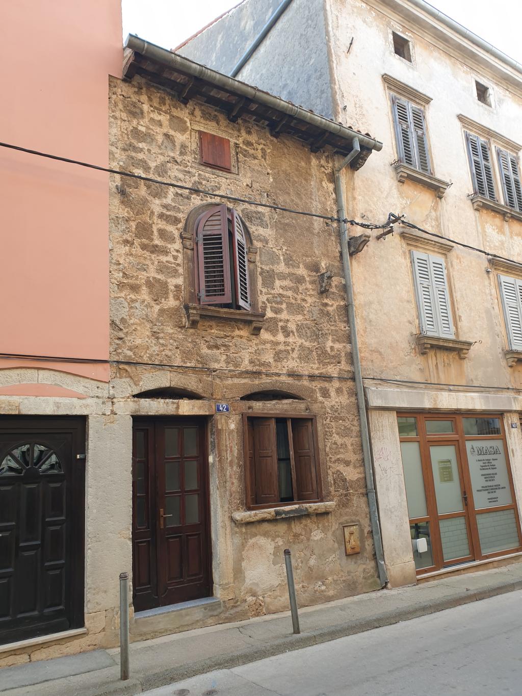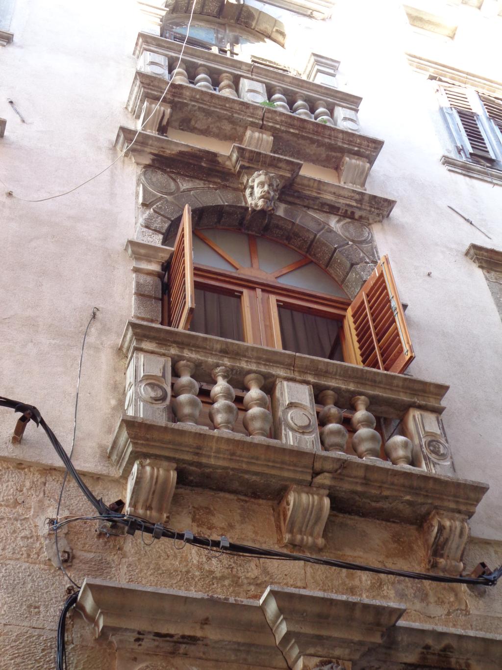 Tako ali drugače – Vodnjan je rojen iz kamna in tak je še danes. Preprost gradbeni material, obstojen in hkrati okras – zlasti plemiških in bogatih meščanskih hiš. Gospa Morena je vsako toliko zaustavila korak in nam usmerjala pozornost na kamnite stile (gotsko – beneški, baročni, renesančni) in detajle. Skoraj vsako hišo, zlasti vzdolž najdaljše ulice (približno 2 km) v Istri, v kateri so drug zraven drugega živeli obrtniki in trgovci, so hiše krasili unikatni grbi, kamnite glave, stebri, balkoni, okna in portali. Balkone so vodnjanski kamnoseki krasili z rastlinskimi motivi. Stebri so imeli uporabno in estetsko funkcijo. Krasili so jih v korintskem stilu. V zgornjih nadstropjih smo opazili tudi nekakšne kamnite nosilce z luknjo, v katere so vstavljali lesene palice, ki so jih uporabljali za obešanje in vlečenje ročno tkanih tkanin. Nekatere hiše imajo še kamnite stopnice – baladurje. Kamnite glave resnega videza nad okni ali vrati, kot da nas opazujejo in kontrolirajo življenje na ulici. Okrašena, večslojna okna (bifore, trifore) dajejo pročeljem razgiban, a skladen videz. Staro mesto pa ima še eno zanimivost najkrajšo in najožjo uličico (50 cm). Sreča, da smo vsi »elegantni« in smo se brez težav sprehodili skoznjo. Posebni so tudi obokani podhodi, ki so skrajšali pot z ene strani najdaljše ulice na drugo stran. V podhodu so zazidani tudi vsi vogali, da se tatiči in nepridipravi niso mogli skriti. Posebnost mesta so tudi notranja dvorišča, ki jih ogreva sonce (izredna zamisel) in dimniki – čisto vsak drugačne oblike.
