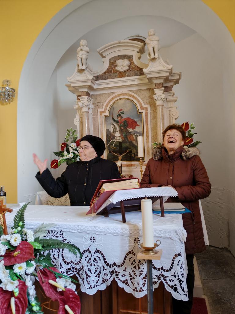 V cerkvici nad vasjo nas je pričakala ga. Bruna Poklar, ki je tudi njena skrbnica. Najprej nam je povedala legendo o sv. Juriju, ki je pokončal lisaškega zmaja. To se je zgodilo nekega davnega, davnega 24. aprila, ki je še danes največji vaški praznik v zahvalo zavetniku. Cerkvico so sezidali in opremili ter večkrat obnovili složni vaščani sami, kot pravi zadnji verz ge. Sonje v pesmi Liščani i Liš´šćice: Si za oniga od´n za se!